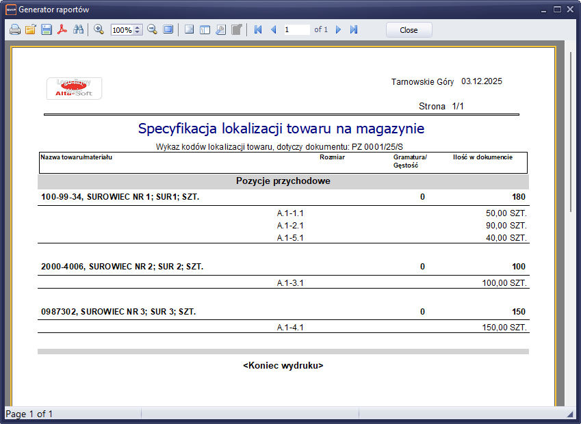 Z poziomu pozycji dokumentu przychodowego dostępny jest wydruk specyfikacji kodów lokalizacji dla danego dokumentu. Jest to dokument przeznaczony dla magazyniera w celu umieszczenia towaru na półkach zdefiniowanych w systemie.
