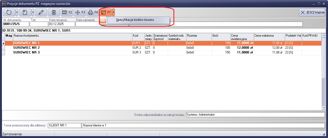 Rysunek 394 Menu kontekstowe wydruku specyfikacji kodów towaru.
