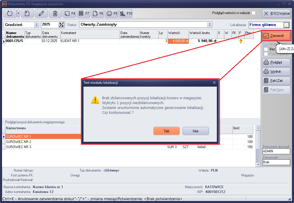 Po potwierdzeniu kontynuacji operacji zamknięcia dokumentu, system automatycznie uzupełni brakujące pozycje lokalizacji. Po uzupełnieniu kodów następuje ponowne testowanie i jeśli wynik testowania jest pozytywny, to system przechodzi do procedury zatwierdzenia dokumentu.
