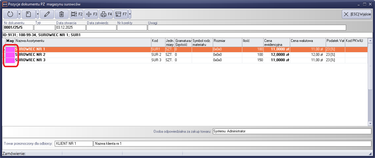 Dodatkową informację o poziomie zbilansowania kodów lokalizacje umieszczono w oknie pozycji dokumentu. Pozycja niezbilansowana oznaczona jest odpowiednim kolorem w kolumnie magazynu. Informacja określa, która pozycja dokumentu wymaga uwagi, pod względem sprawdzenia poprawności bilansu lokalizacji.