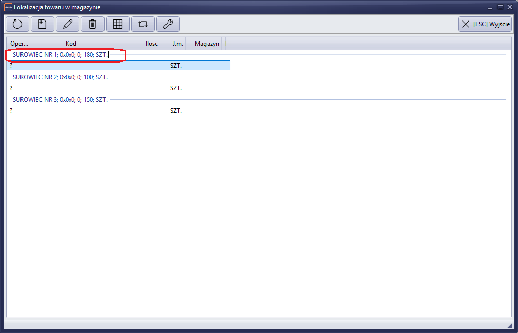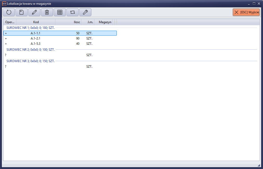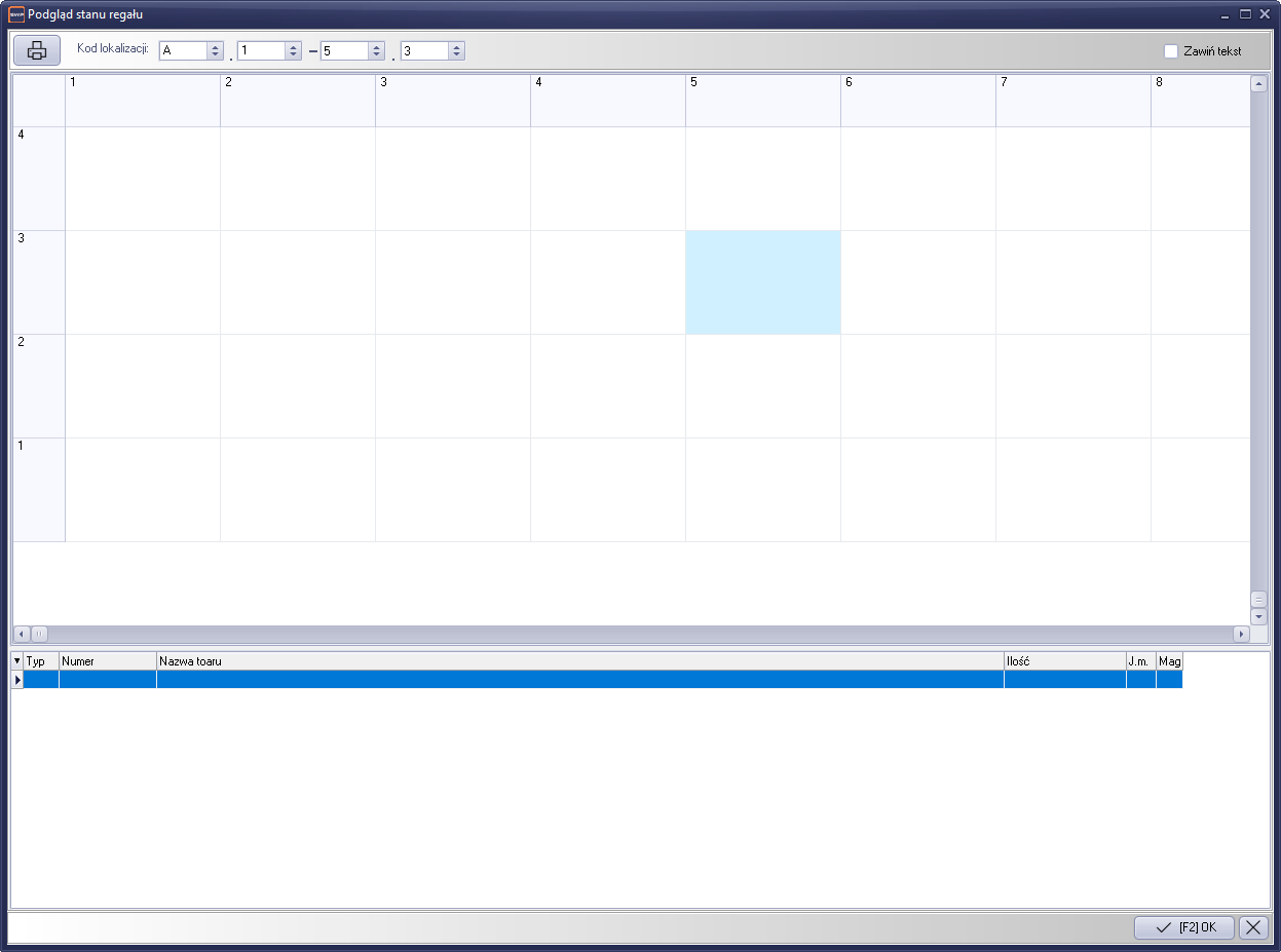 Po uruchomieniu funkcji, na ekranie pojawi się okno z listą pozycji towarowych dokumentu oraz podpiętymi lokalizacjami wraz z ilością na półce. W przypadku pierwszego uruchomienia informacje o kodach lokalizacji będą puste.
