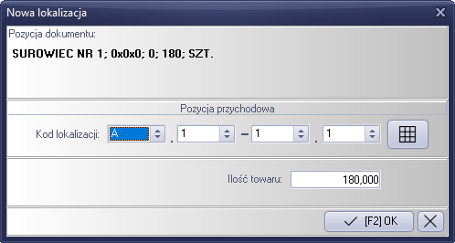 Można również dokonać modyfikacji ilości towaru. W przypadku mniejszej ilości będzie możliwość dodania kolejnego kodu lokalizacji dla danej pozycji dokumentu. Kodów lokalizacji dla jednej pozycji w dokumencie może być wiele, istotną wartością jest sumaryczna ilość, która nie może przekroczyć ilości z pozycji dokumentu przychodowego.