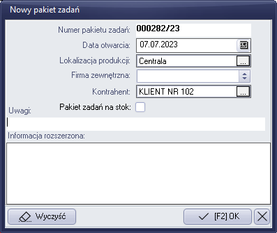 Pole numeru pakietu zostaje uzupełnione automatycznie. Wprowadzamy datę otwarcia, ewentualnie docelowe przeznaczenie jeśli system pracuje w trybie wielo-oddziałowym. W polu wprowadzamy datę realizacji zamówienia oczekiwaną przez klienta oraz nazwę klienta.