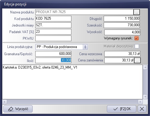 Wydruk – umożliwia wydruk zamówienia produkcyjnego na drukarkę.