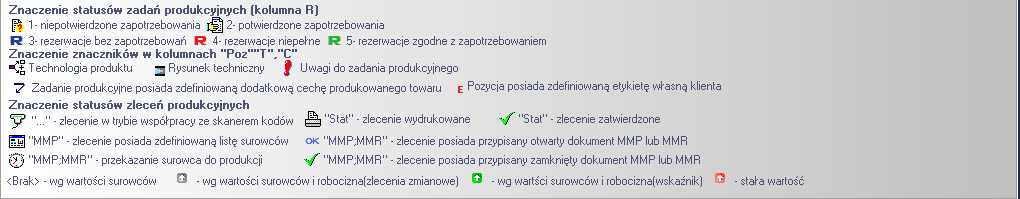 Ctrl + F9 - Opis znaczenia ikon zastosowanych w siatce danych zadań produkcyjnych i nagłówków zleceń produkcyjnych