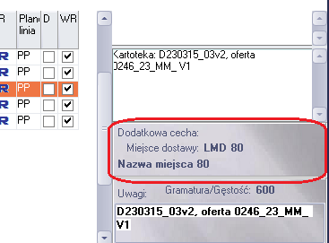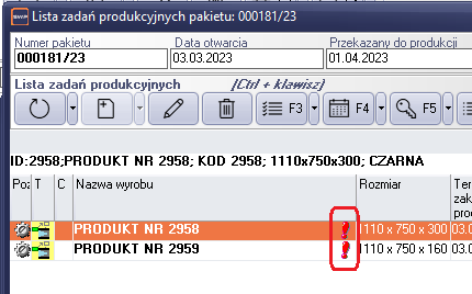 W przypadku informacji dodanej w nagłówku pakietu zadań produkcyjnych, w prawym górnym rogu panelu pozycji zamówienia, pojawi się odpowiednia informacja (czerwony prostokąt).