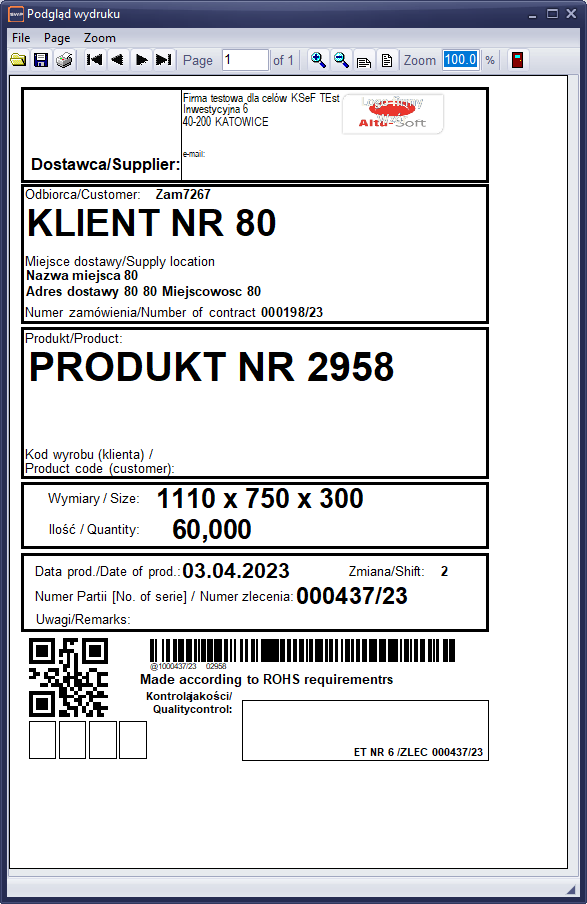 Rysunek 431 Przykładowy wydruk etykiety produktu ze zmienionym miejscem dostawy
