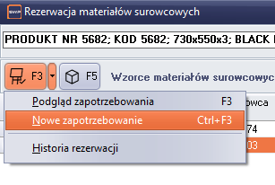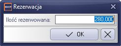 Podczas tworzenia zamówienia, można dokonać rezerwacji towaru znajdującego się na magazynie surowcowym. Rezerwację wykonujemy przy pomocy klawisz „F5”. Na ekranie pojawi się formularz rezerwacji.