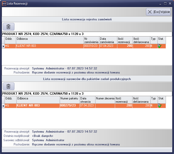 Po uruchomieniu pojawi się okno przeglądu rezerwacji danej pozycji stanu magazynowego.
