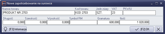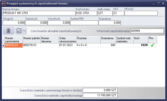 W karcie należy uzupełnić pola Gramatury, symbolu rodzaju materiału oraz ilości zapotrzebowane. Poniżej pól edycyjnych, znajduje się lista towarów już zapotrzebowanych o tych samych parametrach. W dolnym panelu, dodatkowo zamieszczono informację o ilości już zamówionego towaru u dostawcy oraz sumarycznej ilości towaru z listy zapotrzebowania.
