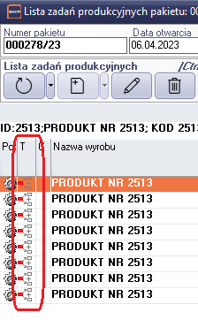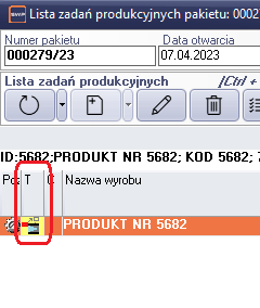 Powiązanie rysunku technicznego z kartoteką produktu widoczne również jest z poziomu zadań produkcyjnych. Jeśli rysunek zastał powiązany w kolumnie "T", będzie widoczna odpowiednia ikona.