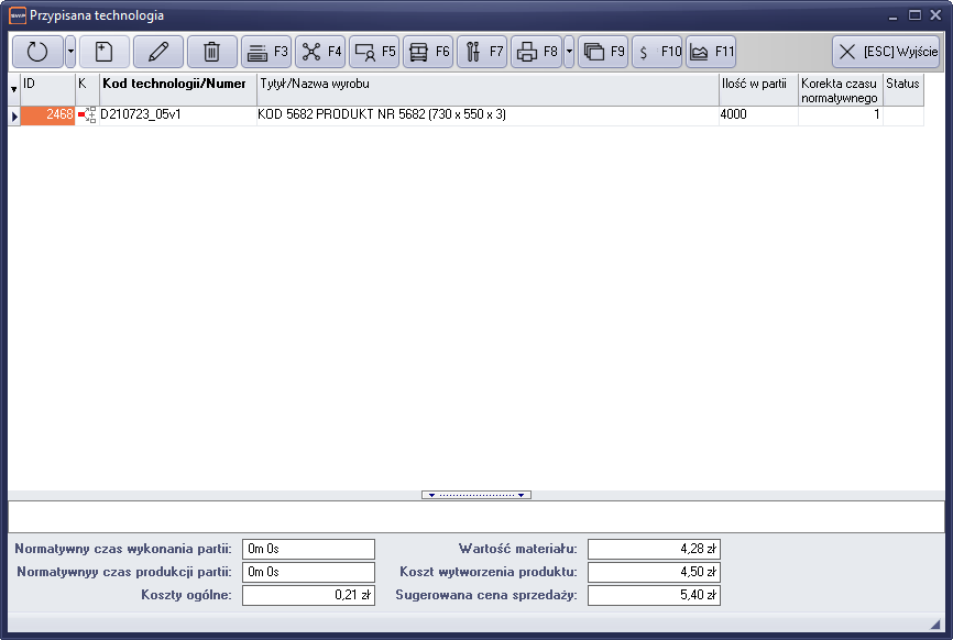 Podobnie sytuacja wygląda z lista technologii. W celu dodania technologii do danej kartoteki produktu, możemy to zrobić przy pomocy funkcji „Alt+F8”.
