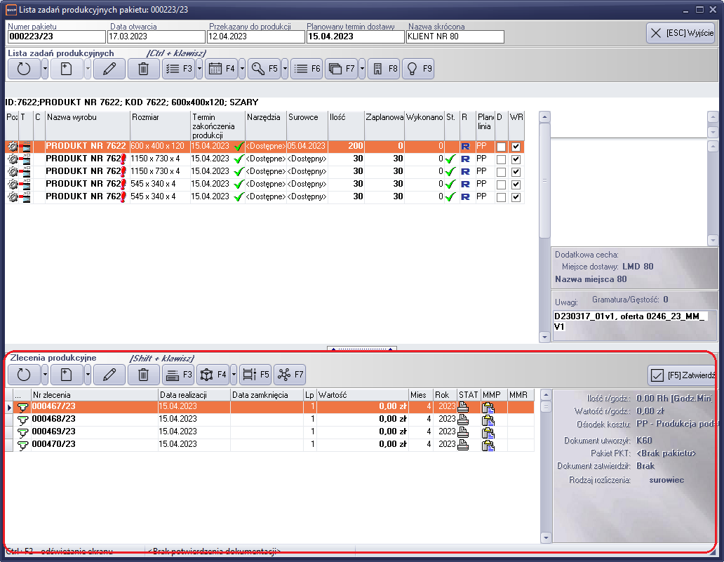 Zlecenia produkcyjne, można tworzyć w trybie "zadania w produkcji". Okno obsługi zleceń produkcyjnych znajduje się w dolnej części ekranu.