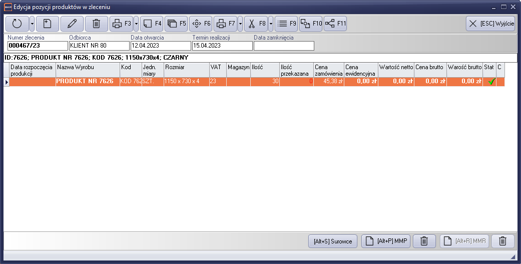 Po wprowadzeniu informacji i potwierdzeniu klawiszem „OK”, przechodzimy do okna pozycji zlecenia produkcyjnego.