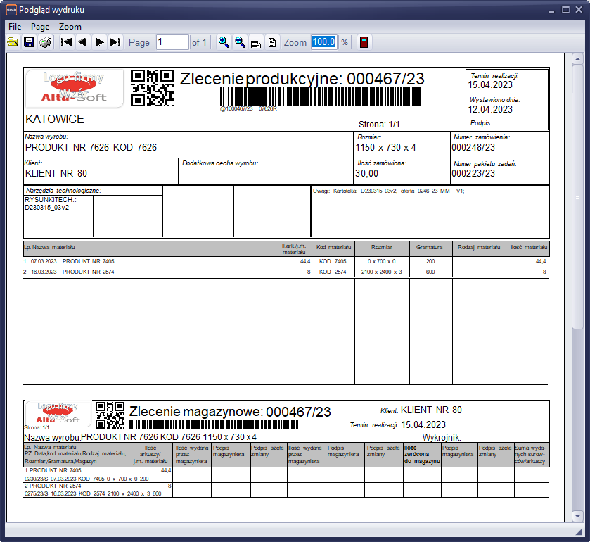 Rysunek 452 Przykładowy wydruk zlecenia produkcyjnego