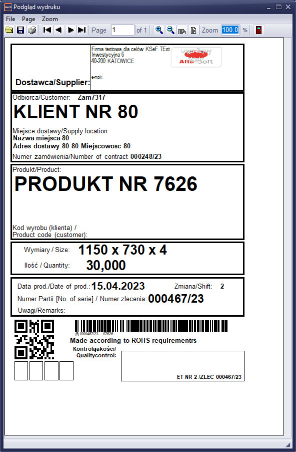 Rysunek 453 Przykładowy wydruk etykiety