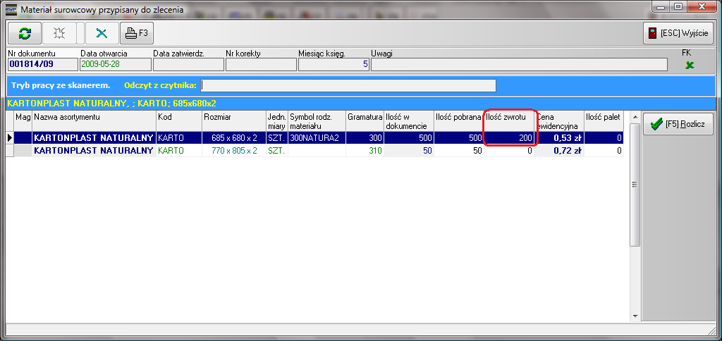 Po wprowadzeniu odpowiedniej ilości zwrotu i potwierdzeniu klawiszem "OK [F2]", system powróci do okna pozycji dokumentu i będzie oczekiwał na kolejny odczyt skanera. W kolumnie Ilość zwrotu pojawi się wprowadzona ilość.