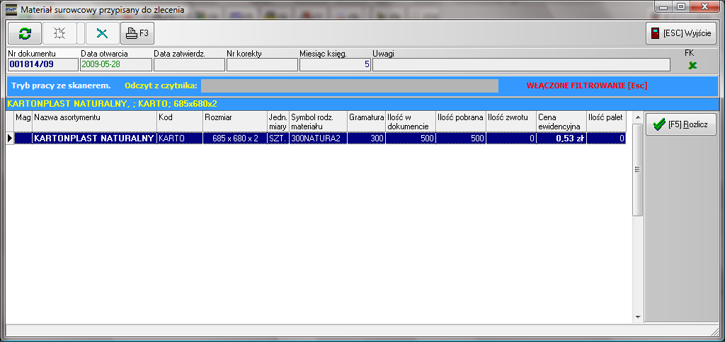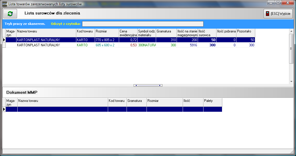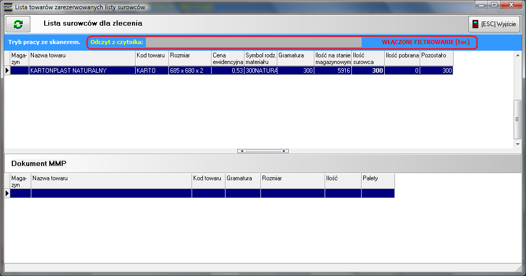 Okno zostało podzielone na dwie części. Pierwsza górna to "Lista surowców dla zlecenia", druga u dołu ekranu to "Dokument MMP". Aby dodać pozycje do dokumentu, system wymaga pracy ze skanerem kodu kreskowego. Po otwarciu okna, ustawia się ono automatycznie w tryb współpracy ze skanerem, świadczy o tym mrugający kursor w polu "Odczyt z czytnika". System oczekuje na podanie kodu z etykiety towaru surowcowego. Po zeskanowaniu kodu, system wyfiltruje pozycje odpowiadające parametrom z etykiety surowca. Program porównuje kod kartoteki, rozmiar i i gramaturę surowca. system pokaże tylko te pozycje ,które spełniają podane warunki . Ponadto zostanie zablokowane pole czytnika i w panelu czytnika pojawi się napis informujący o stanie filtrowania.