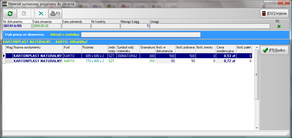Tryb pośredniego rozliczenia surowców przy pomocy skanera kodów kreskowych