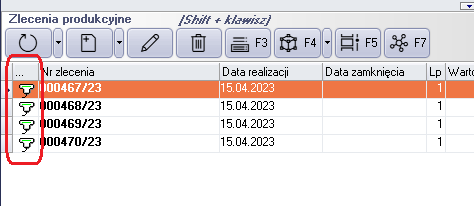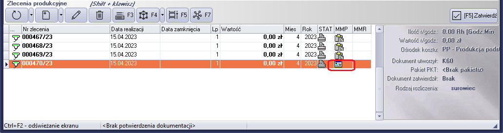 W oknie nagłówków zleceń, w kolumnie MMP, pojawi się nowa ikona oznaczająca, że została utworzona lista surowców i zlecenie nie posiada dokumentu MMP.