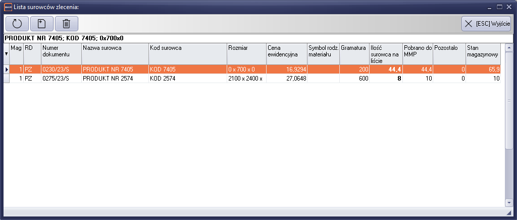 Po przypisaniu wszystkich surowców, możemy powrócić do okna do listy surowców zlecenia.