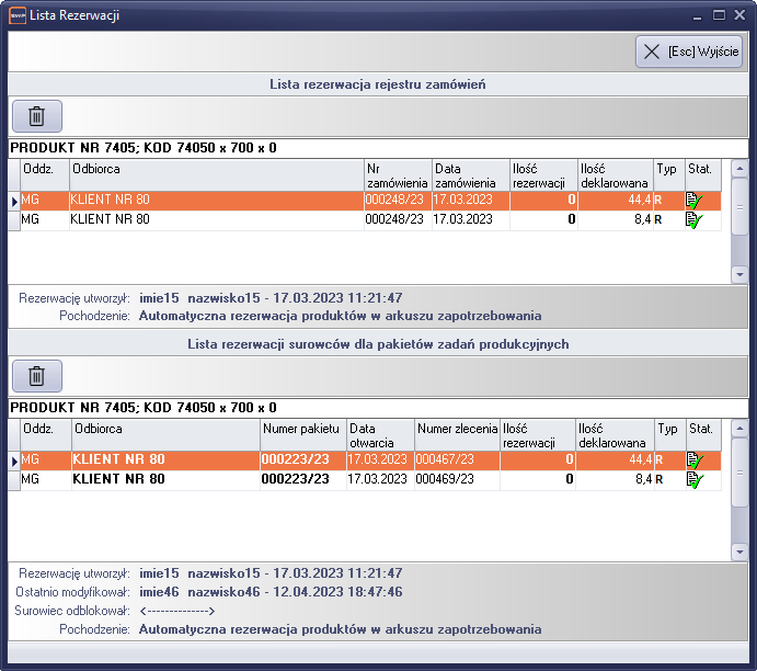 W oknie "Listy rezerwacji surowców dla pakietów zadań produkcyjnych", została dodana kolumna "Numer zlecenia". Jeśli w kolumnie istnieje numer zlecenia, oznacza to że rezerwacja jest rezerwacją pod zlecenie. Jeśli w kolumnie nie ma informacji o numerze, oznacza to że jest to rezerwacja ogólna zadania produkcyjnego. Dodatkowo w oknie umieszczono informację o osobie która daną rezerwację utworzyła oraz kiedy i o której godzinie. Poniżej znajduje się jeszcze informacja o ostatniej modyfikacji rezerwacji. Informacja dotyczy rezerwacji ogólnych, które mogły być podzielone lub przepisane na rezerwacje dla zlecenia.
