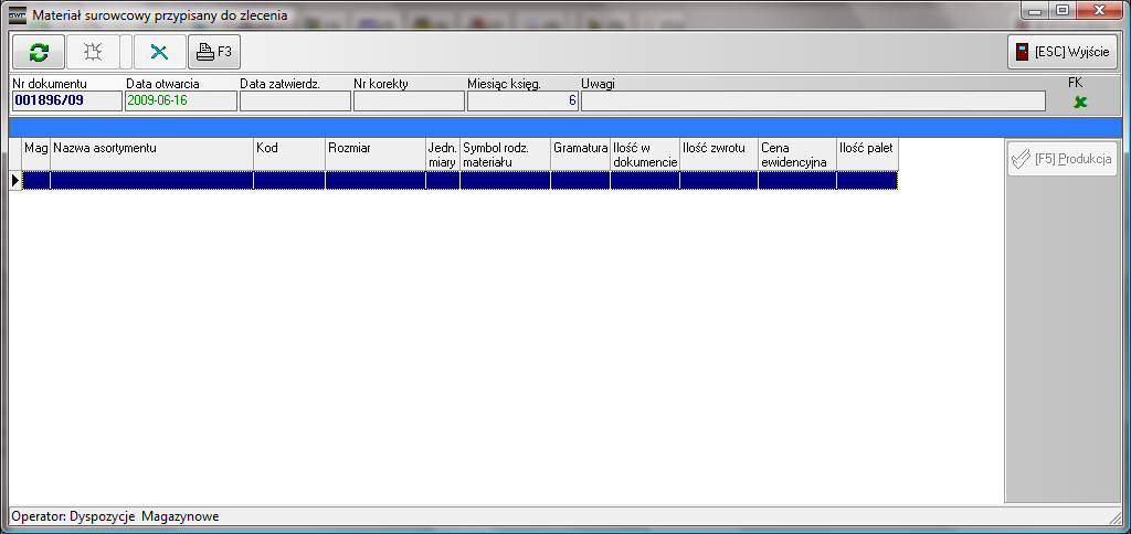 Po wprowadzeniu do dokumentu całości surowca do produkcji, należy zakończyć etap wydawania surowca i przejść do etapu rozliczenia. W tym celu naciskamy przycisk "Produkcja [F5]". Efektem wykonania operacji, na magazyn produkcyjny zostanie przesłany materiał surowcowy, a następnie zostanie naliczona wartość zlecenia produkcyjnego. Oczywiście w tym momencie nie będzie możliwe jeszcze zakończenie zlecenia, ponieważ system czeka na rozliczenie dokumentu MMP.
