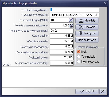 Normatywny czas wykonania – Wartość wyliczona na podstawie wprowadzonych operacji technologicznych. Wartość jest dzielona przez ilość produktów w partii.