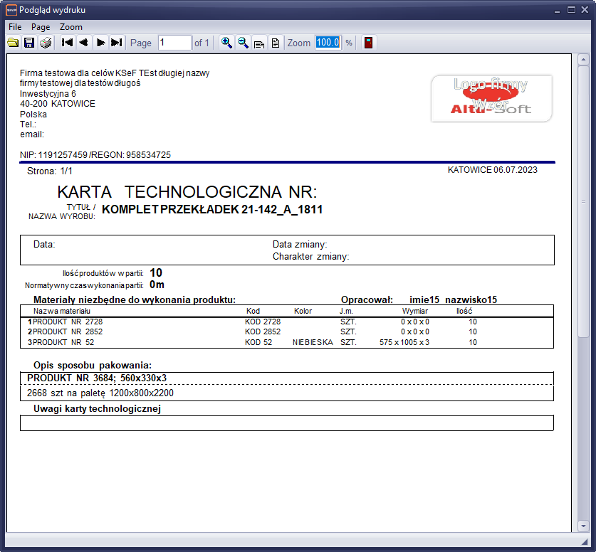 Końcowym etapem tworzenia karty technologicznej jest wydruk karty. Poniżej przedstawiono przykładowy wydruk karty technologicznej.