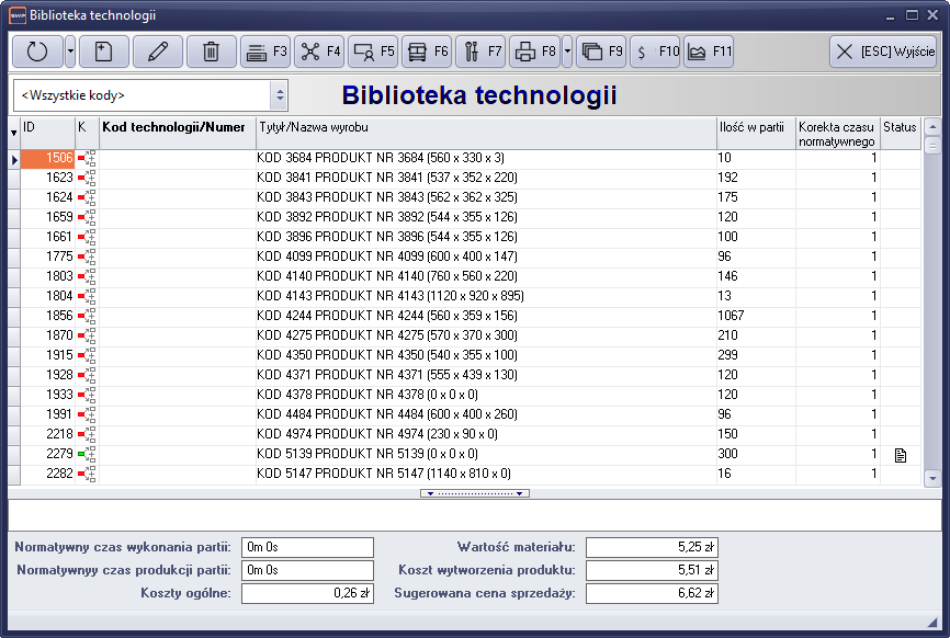 Przy pomocy standardowych operacji możemy dodawać, edytować i usuwać karty technologiczne.