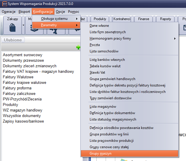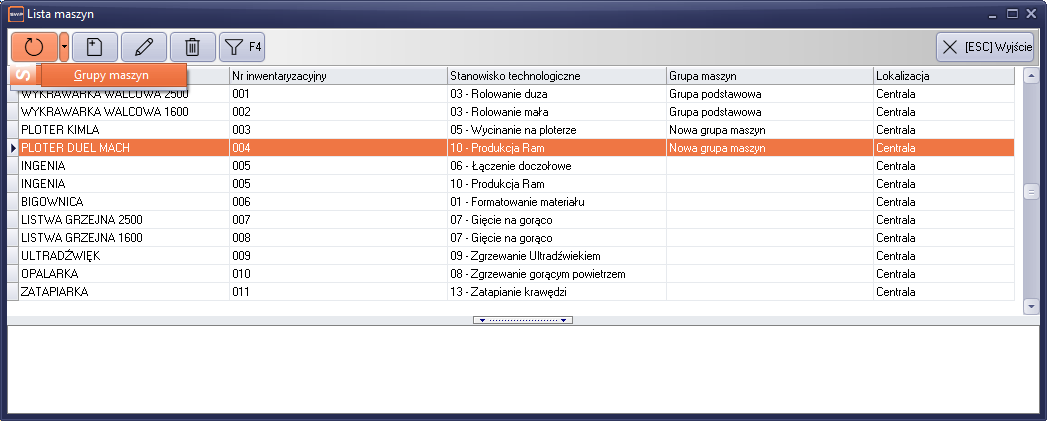 Definicję grup maszyn możemy wykonać poziomu menu technicznego menu głównego programu. Konfiguracja->Parametry->Grupy maszyn.