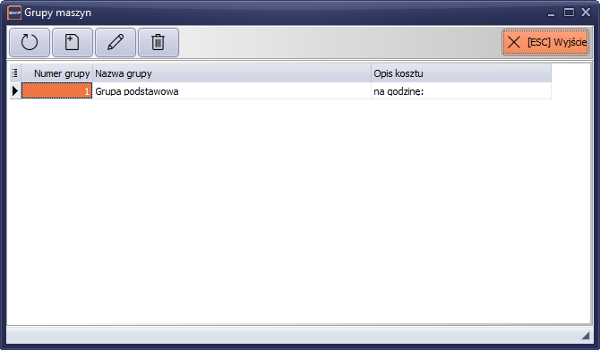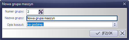 W celu zdefiniowania grupy należy podać numer grupy w zakresie od 1-10. Nazwę grupy i opcjonalnie opis sposobu rozliczenia kosztów maszyny.