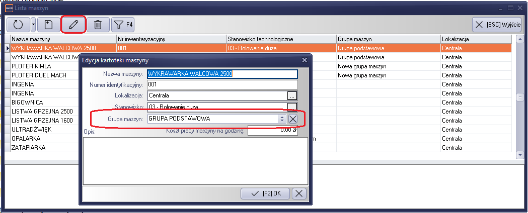 Maszynę przypisujemy do grupy z poziomu okna obsługi maszyny. Poniżej przedstawiony jest rysunek, w jaki sposób wykonujemy przypisanie maszyny do grupy maszyn.