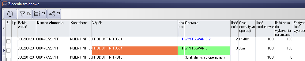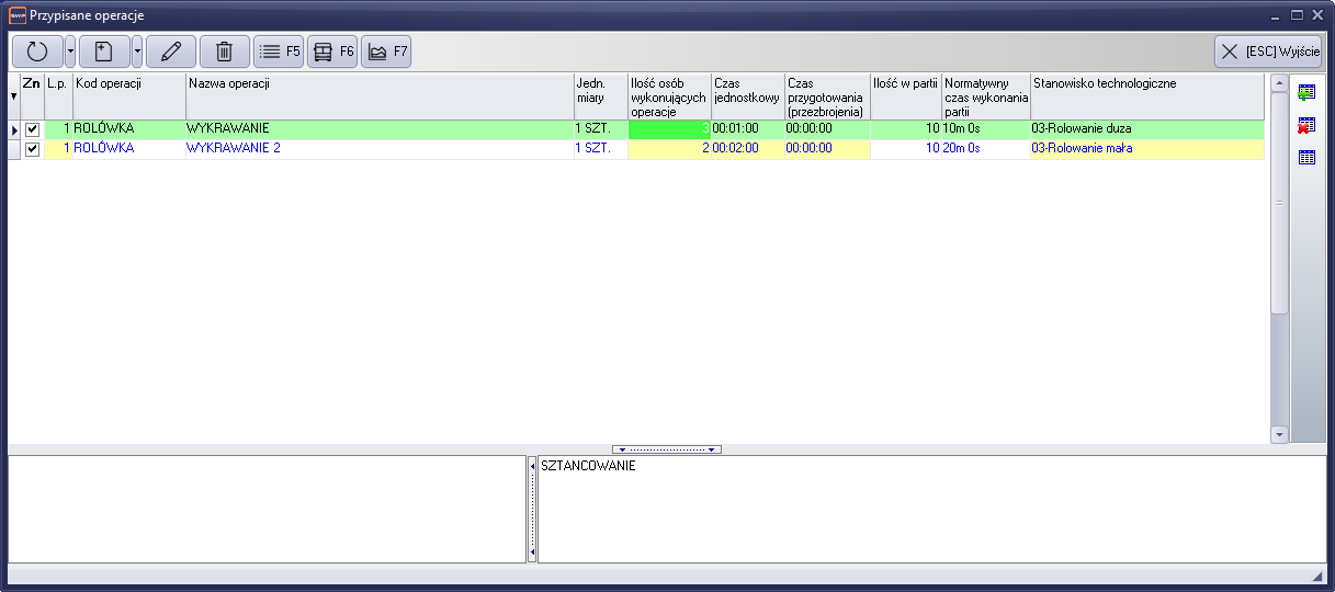 Po przypisaniu, operacja główna podświetlona jest kolorem zielonym. Operacje alternatywne posiadają ten sam numer operacji i oznaczone są kolorem niebieskim.