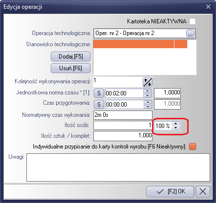 Wprowadzenie współczynnika (KWO), umożliwia zdefiniowanie korekty wydajności w zakresie od 0% do 100%. W przypadku zmniejszenia ilości osób, korekty na minus o zadany wskaźnik i na plus w przypadku zwiększenia ilości osób. W przypadku zdefiniowania wartości wskaźnika na 0%, wydajność wykonania operacji nie zmienia się niezależnie od ilości zdefiniowanych osób w zadaniu. Natomiast w przypadku korekty 100% zmiana jest w zakresie 100% wydajności dla ilości osób wprowadzonych (wg starych zasad).