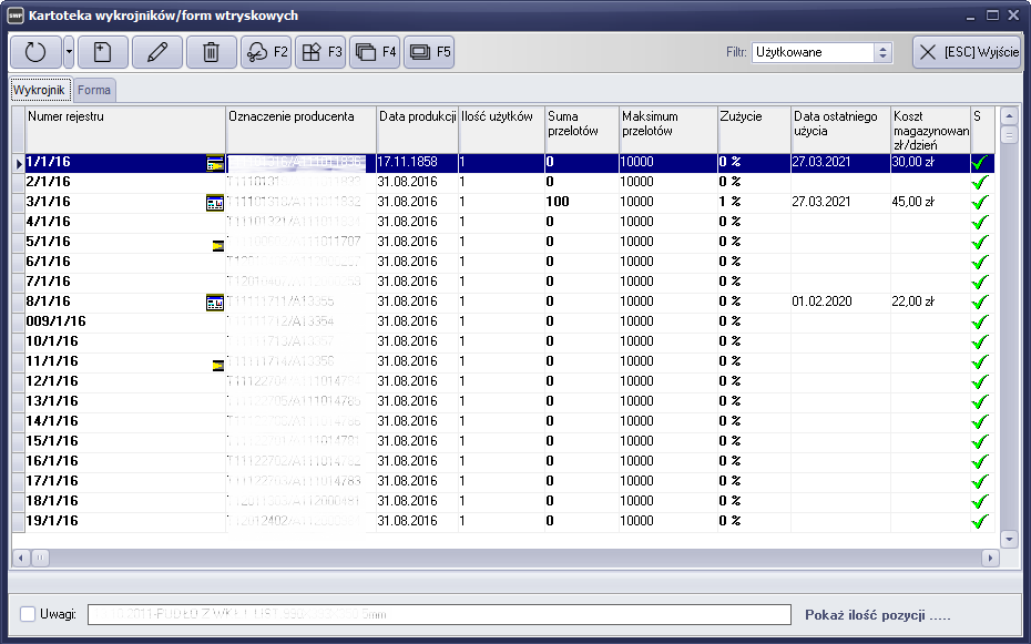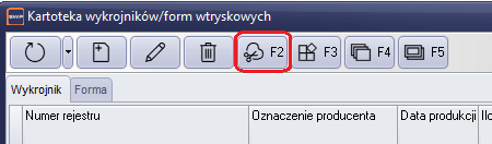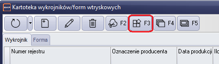 Zmianę rodzaju przeglądanych pozycji rejestru wykonujemy poprzez kliknięcie na zakładkę "Wykrojnik / forma"