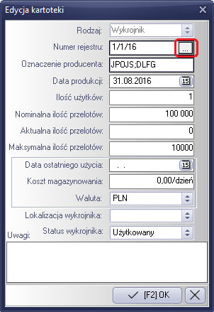 Numer kolejny wykrojnika powstaje po powiększeniu o jeden, numeru ostatnio wprowadzanego wykrojnika dla danego kontrahenta, niezależnie dla wykrojników i form wtryskowych.