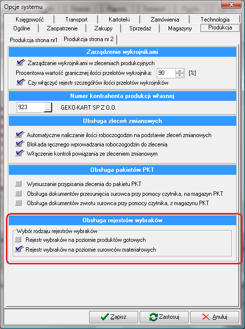 Rodzaj rejestru, należy zdefiniować w opcjach programu. Wybieramy zakładkę "produkcja".
