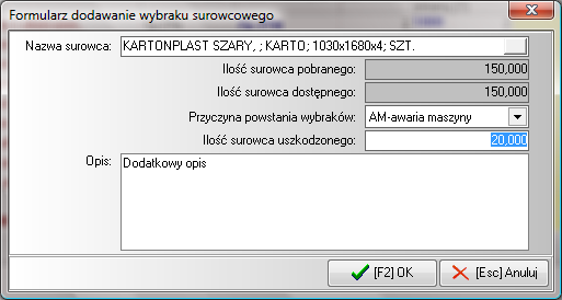 Formularz umożliwia zdefiniowanie "Przyczyny powstania wybraków" oraz ilości surowca uszkodzonego. Ilość surowca uszkodzonego należy wprowadzić w takich jednostkach w jakich surowiec jest zarejestrowany w systemie. Ponadto można wprowadzić dodatkowy opis dotyczący danego wybraku.
