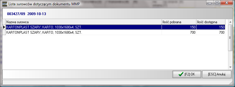 W oknie pokazane zostały dwie kolumny z ilościami. Kolumna "Ilość pobrana", to jest ilość jaka została pobrana do dokumentu MMP, na dane zlecenie. Natomiast kolumna "Ilość dostępna", to ilość pobrana pomniejszona o ewentualne już wprowadzone pozycje wybraków dotyczących tego surowca. System pozwoli na wprowadzenie jednie do rejestru takiej ilości wybraków, jaka jest dostępna w kolumnie "Ilość dostępna".