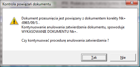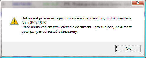Jeśli zajdzie potrzeba anulowania zatwierdzania dokumentu przesunięcia MM-. Takie anulowanie można wykonać jedynie z poziomu okna nagłówków dokumentów MM (Klawisz F4). Jeśli na podstawie dokumentu MM- został utworzony dokument Nk+ i dokument korekty jest zatwierdzony, wówczas system nie pozwoli na anulowanie zatwierdzenia dokumentu przesunięcia MM-. W przypadku próby anulowania pojawi się odpowiedni komunikat.