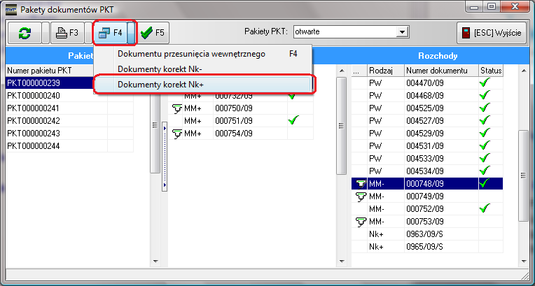 Ad.4. Tworzenie korekty „Nk+”. Dokument korekty można wykonać z poziomu menadżera pakietów PKT. Podczas tworzenia dokumentu system umożliwia wybór pozycji na podstawie listy towarów dokumentów MM+ należących do danego pakietu.