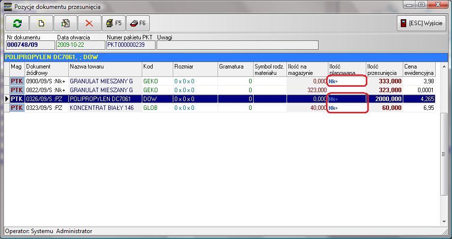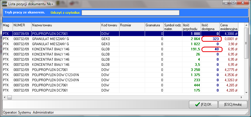 Po potwierdzeniu, pozycja będzie oznaczona w liście pozycji dokumentu symbolem "Nk+". Różnica pomiędzy wprowadzoną ilością i ilością dostępną na magazynie, będzie wprowadzona do dokumentu korekty Nk+.
