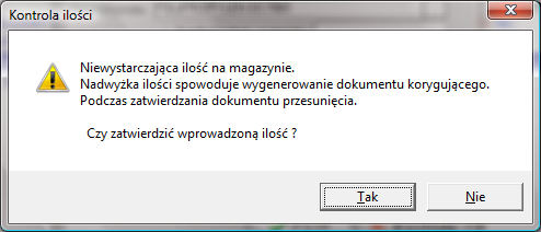 Jeśli wprowadzona została ilość większa niż istniejąca na stanie magazynowym, wówczas system zażąda potwierdzenia takiej operacji.