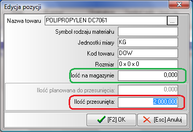Pobraną pozycję można jeszcze edytować (przy pomocy klawisza "Edycja" lub skrótu klawiszowego "Ctrl+E"), pozycję taką można po prostu skasować. W polu "Ilość przesunięcia" system podpowie aktualny stan magazynowy. Ilość tą można pomniejszyć zgodnie z potrzebą lub wpisać ilość większą niż stan magazynowy. Pozwala to na wprowadzenie ilości potrzebnych do wygenerowania dokumentu korygującego Nk+. Po wprowadzeniu odpowiedniej ilości operację potwierdzamy klawiszem "OK[F2]".