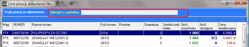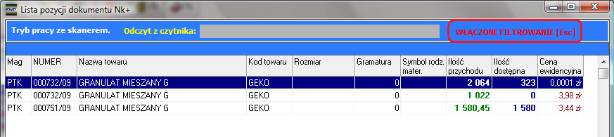 Następnie system odfiltruje pozycje pasujące do czytanej etykiety. Po odfiltrowaniu można pobrać pozycję do dokumentu poprzez wskazanie pozycji i naciśnięcie klawisza "Enter".