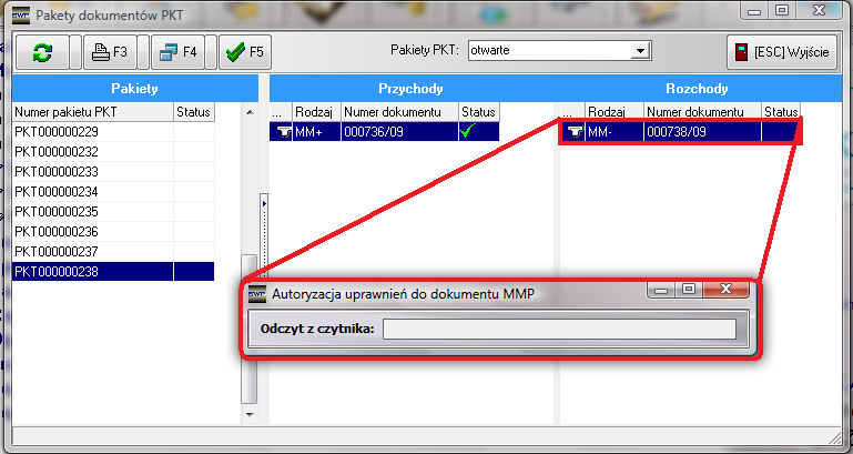W celu obsługi w tym trybie dokumentu, należy otworzyć dokument z poziomu menadżera pakietów PKT, poprzez podwójne kliknięcie myszy na wskazanym dokumencie MM-. Jeśli system został prawidłowo skonfigurowany na ekranie powinno pojawić się okno autoryzacji.