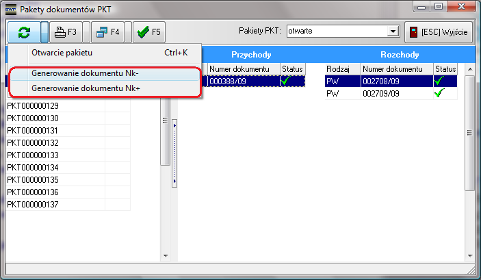 Dokument Nk+, po wygenerowaniu nie jest automatycznie zatwierdzany. Zatwierdzenie należy wykonać z poziomu nagłówków dokumentów magazynowych (tak jak zatwierdza się wszystkie dokumenty magazynowe). Otwarcie okna dokumentów magazynowych można wykonać z poziomu Menadżera pakietów PKT.