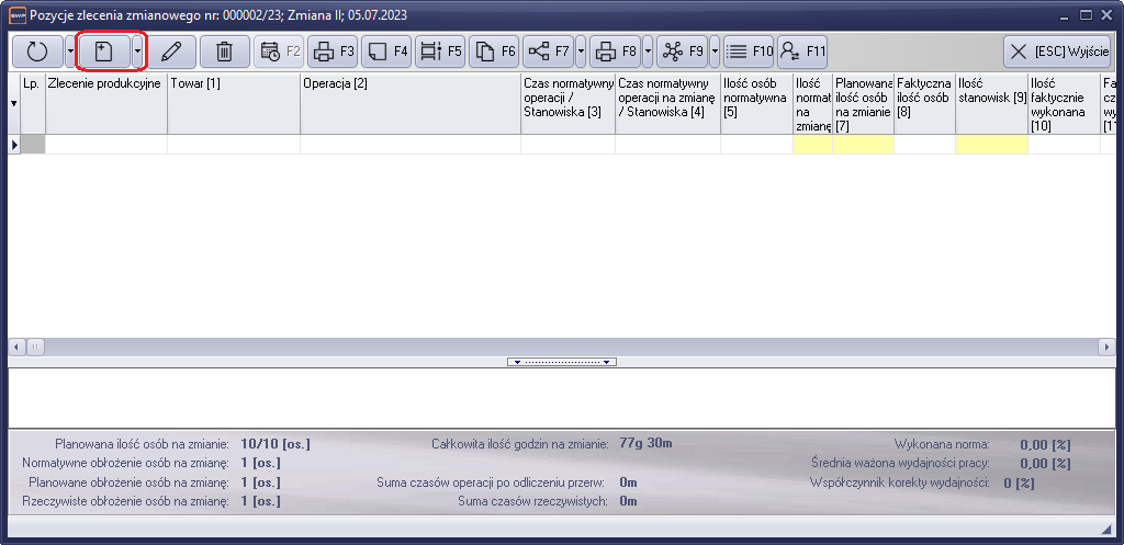 "Planowana ilość osób na zmianie" - Jest to ilość zdefiniowana w nagłówku dokumentu w polu "Ilość osób na zmianie". Ilość ta jest "łamana", przez faktyczną ilość osób, którą można zmodyfikować w sposób opisany powyżej. Faktyczna ilość osób brana jest pod uwagę przy obliczeniach średniej wydajności zmiany i wykonanej normy.