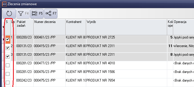 Znaczenie poszczególnych kolumn listy operacji w zleceniu zmianowym: